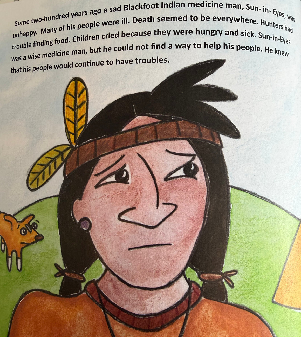 The Indian becomes sleepy and has a dream. Sun-in-Eyes hears the spider apologize as it asks for forgiveness. It then tells the Indian that if the Indians would make a web and hang it in the door of each tepee, the illness, fighting, and lack of food would no longer be a problem. Bad dreams would cease. The Indians do this, and for many years they have no bad dreams. Sun-in-Eyes traveled across the country and shared this information with other Indian tribes in Texas and up into Canada. The man made web is called a dream catcher.