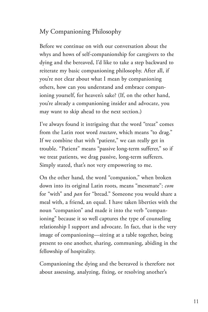 Based on Dr. Wolfelt's unique and highly regarded philosophy of "companioning" versus treating mourners, this self-care guide for professional and lay grief caregivers emphasizes the importance of taking good care of oneself as a precursor to taking good care of others. Bereavement care is draining work, and remaining empathetic to the painful struggles of mourners, death, and dying, day in and day out, makes caregivers highly susceptible to burnout. This book demonstrates how caring for oneself first allows one to be a more effective caregiver to others. Through the advice, suggestions, and practices directed specifically to caregiving situations and needs, caregivers will learn not to lose sight of caring for themselves as they care for others.