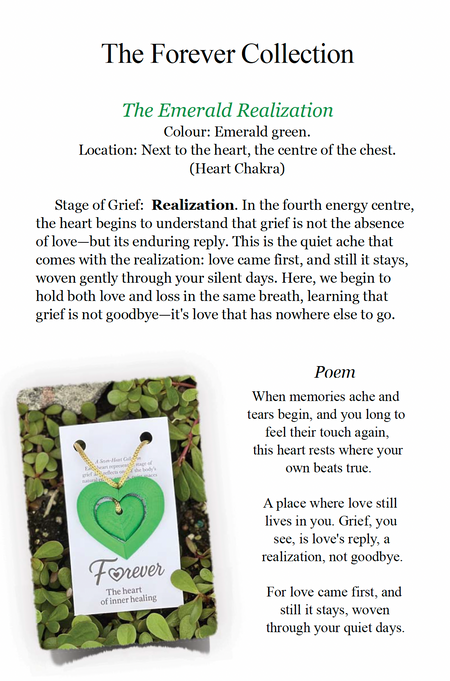 Stage of Grief: Realization. In the fourth energy centre, the heart begins to understand that grief is not the absence of love—but its enduring reply. This is the quiet ache that comes with the realization: love came first, and still it stays, woven gently through your silent days. Here, we begin to hold both love and loss in the same breath, learning that grief is not goodbye—it's love that has nowhere else to go.