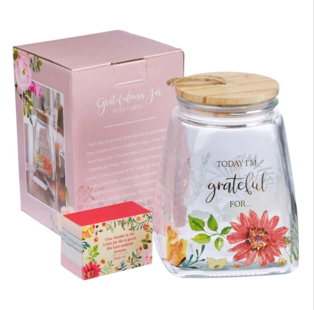 Let the Today I'm Grateful For... Glass Gratitude Jar with Cards help you remember the blessings God sends every day. Some blessings are so incredible they are impossible to forget. Other blessings seem to get lost in the busyness of work, family, and school assignments, and end up forgotten by Friday. Wouldn't it be amazing if we could remember all the ways that God has showered His blessings on us? That's where the Glass Gratitude Jar with Cards comes in. Record God's blessings on one of the 365 cards of the card pad and fill the jar. The cards will be filled with joyful experiences, answered prayers, and tender memories. Then, once all the cards are used up, open the jar to read all the surprising ways God has blessed you throughout the previous year. Vibrant orange, pink, and yellow flowers adorn the beautifully shaped glass jar. Lovely gold lettering states the purpose of the jar Today I'm Grateful For... The same prompt appears on each of the 365 cards. On the front of the cards, a floral design surrounds a series of Bible verses while the back of the card offers the prompt and lines to record your answer. A bamboo lid with a natural fiber loop allows easy access to the contents of the jar while keeping moisture from affecting the cards. To keep the gold foiled text shiny, we recommend handwashing the jar. The Today I'm Grateful For... Glass Gratitude Jar with Cards makes an excellent gift for a young family as they navigate the wonderful but exhausting days of having little ones in the house. This gratitude jar is also a suitable gift for a grandparent or parent that has reluctantly downsized and is adjusting to a new living situation. Keep a jar for yourself to remember all the ways you saw God at work in both the big and small events in your life. The Today I'm Grateful For... Glass Gratitude Jar with Cards is an excellent keepsake that will have you humbly celebrating all the blessings God bestows every day! Floral Design Gold Foiled Text Glass Jar Bamboo Lid with Natural Fiber Loop 365 Full-color Gratitude Cards Not Intended for Use in Microwave, Dishwasher, or Freezer Handwash Recommended Packaged in a Gift Box Jar Size: 6.7" x 4.8" x 4.8" (170 x 122 x 122mm)