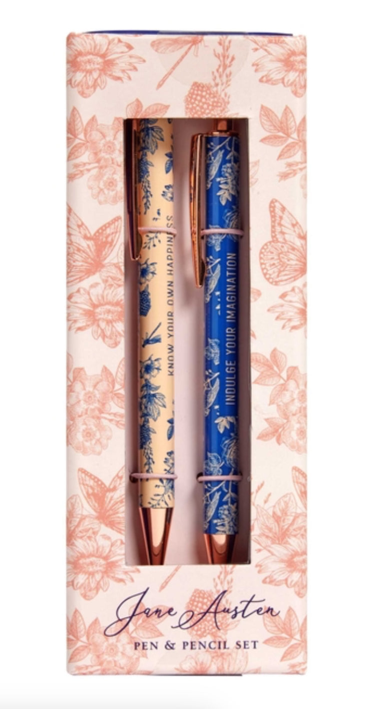Featuring a beautiful floral design and quotes from Jane Austen's Pride and Prejudice and Sense and Sensibility, this set includes a ballpoint pen in a delicate blush pink design and a mechanical pencil in a gorgeous midnight blue design.