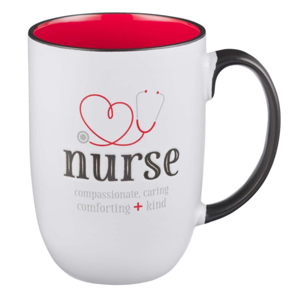 Thank and acknowledge the nurse in your life for her strength and compassion with the Nurse Ceramic Coffee Mug. Nurses need an extra dose of encouragement for consistently displaying compassion as they care for others. This stylish white ceramic coffee or tea mug features the word in black lower case letters entwined in heart-shaped cherry red stethoscope tubing.
