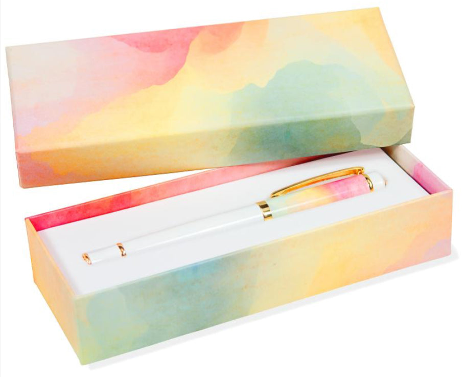 Elegant roller ball pens of solid brass construction with lacquer finish ] Black ink ] Fine 0.5 mm line ] Matching presentation box measures 6-7/8" x 2-3/4" x 1-3/8" (17.5 cm x 7 cm x 3.5 cm)