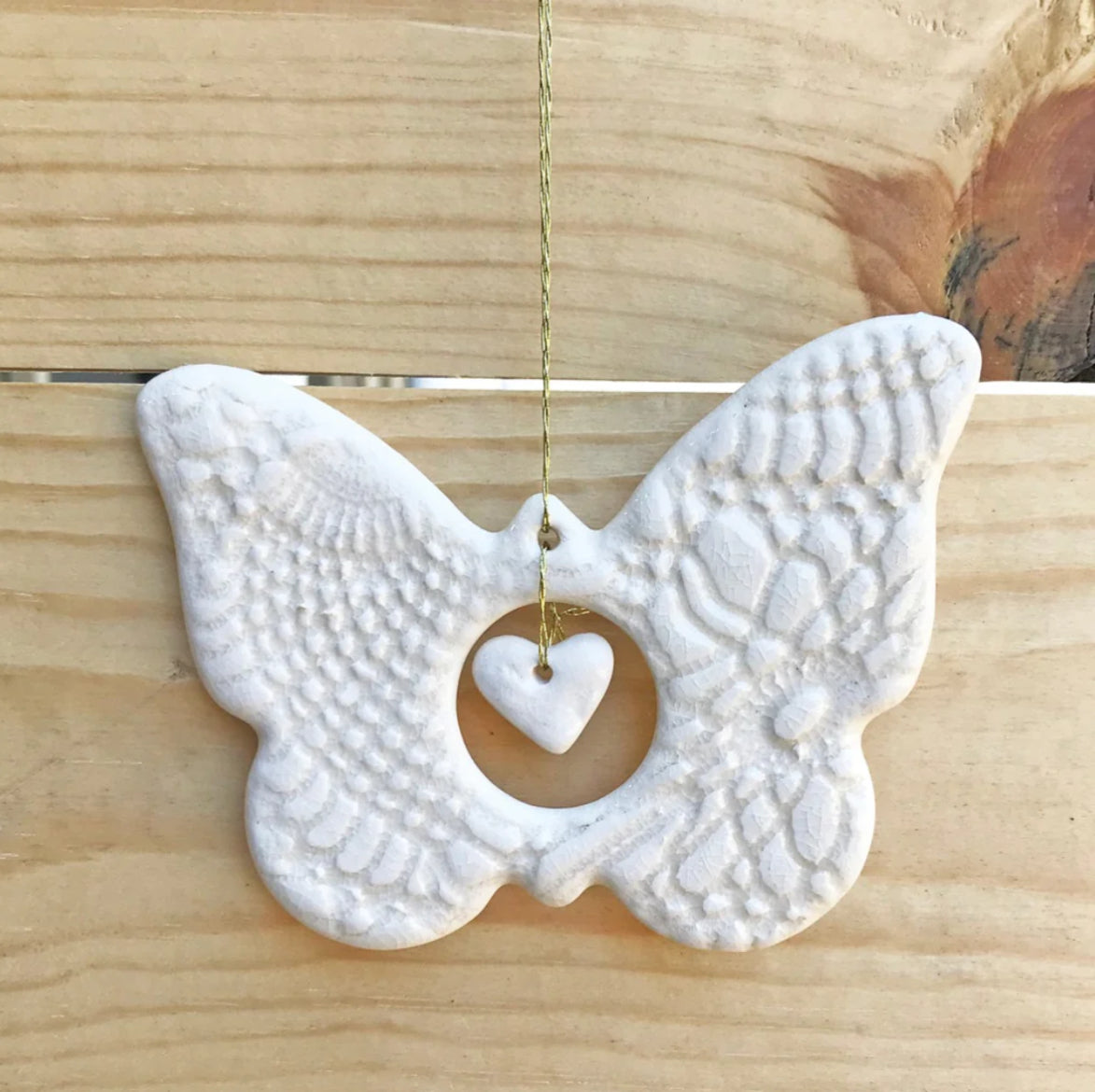 The butterfly, a symbol of rebirth, has been captured in this ornament. At the center of the white, textured ceramic butterfly is a suspended heart, which makes noise when the butterfly moves. It can be used as a holiday ornament, a wind-chime, or as a remembering gift to loved ones.